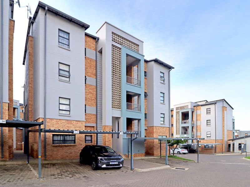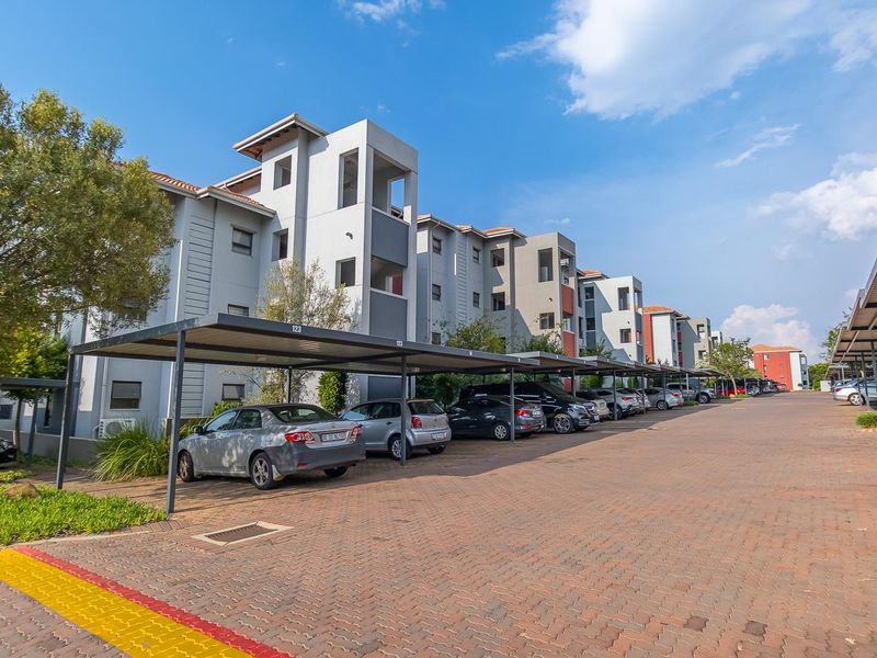 Relaxed suburban living in Barbeque Downs, Midrand with shops and easy highway access; second-floor apartment offers a modern kitchen, communal pool, secure setting and one-bed, one-bath with covered parking.