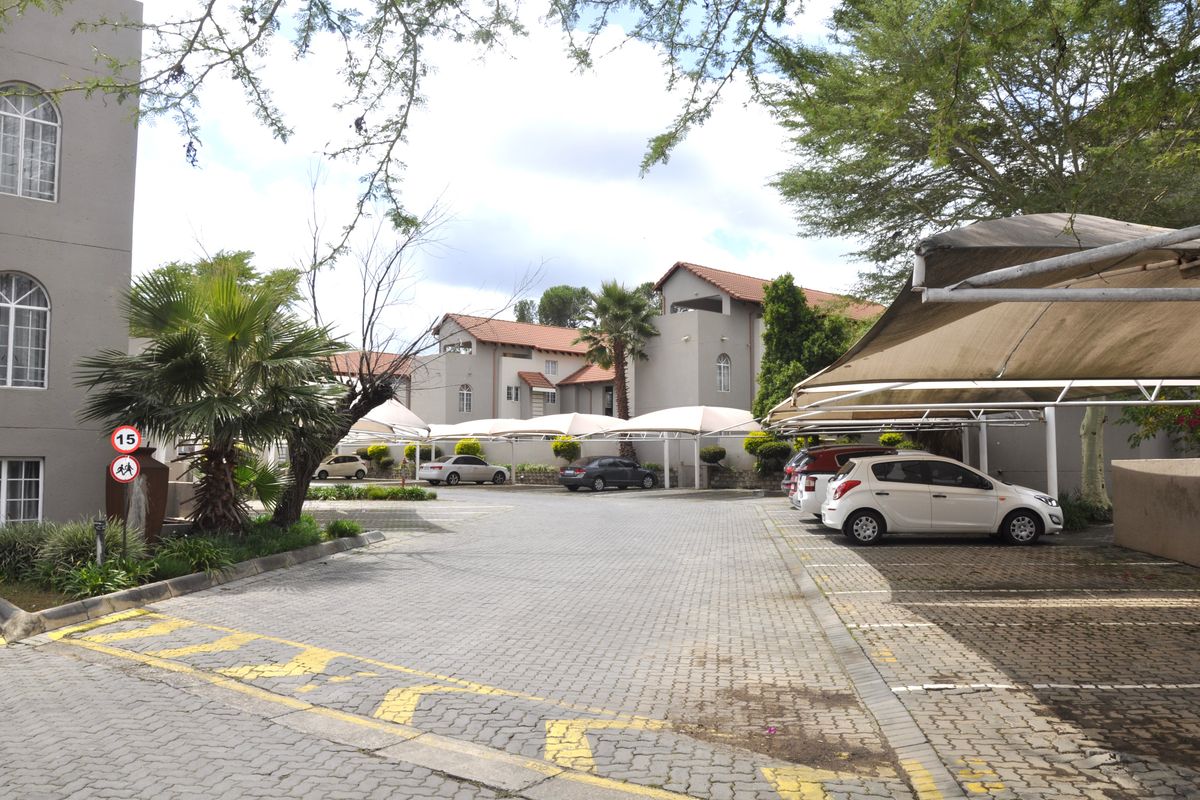 Entertain with sundowners on dual balconies and a warm wooden loft deck in Erand Gardens, Midrand — central to shops and highways; two-bedroom, one-bath unit with double covered parking.