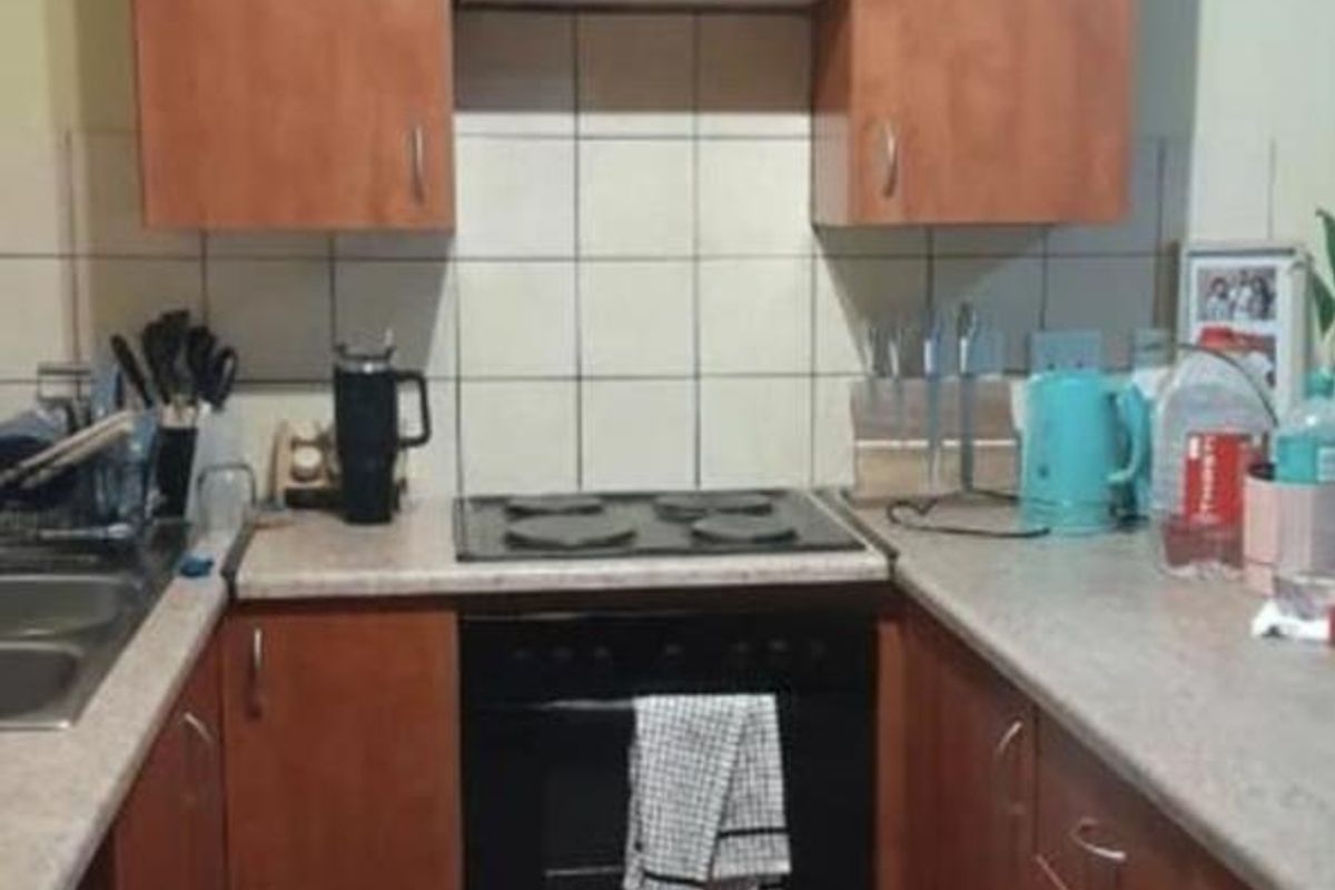 The entrance is fitted with a security gate. On the left as u come in you get the bedroom. It has built-in cupboards. Next you find the bathroom bathshower combination, toilet and basin. The living area is open plan with kitchen cupboards and under-counter oven with hob. All floors are tiled.