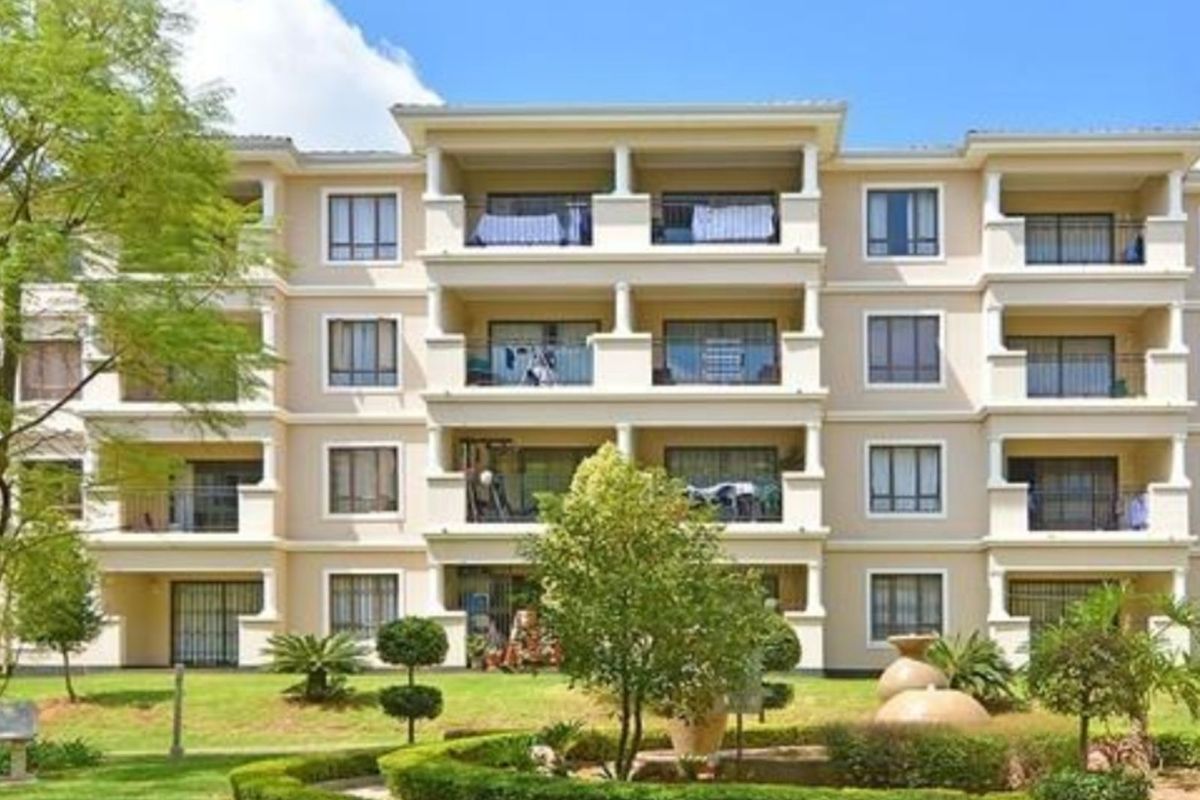Upmarket Phoenix Regent living minutes from Carlswald Lifestyle Centre and Grand Central Airport — sunlit upper-floor apartment with private balcony overlooking landscaped gardens and water features, open-plan granite kitchen.
