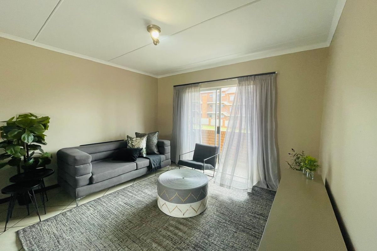 Effortless commuting between Johannesburg and Pretoria in secure estate living, contemporary finishes, granite kitchen and solar geyser; two-bedroom, one-bath unit with lockup garage and carport.