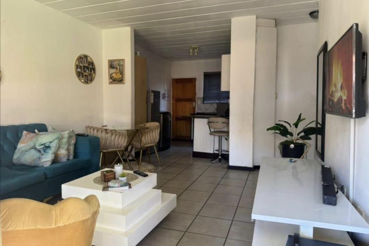 Easy lock-up-and-go living in Midrand's central business hub, steps from the Gautrain bus stop. Ground-floor unit with modern open-plan kitchen, patio and communal pool — two bedrooms, one bathroom.