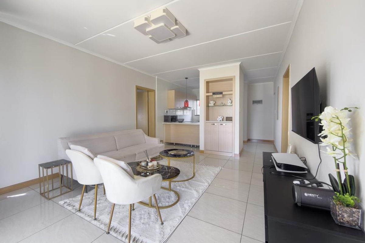 Relaxed complex living with easy Gautrain access and nearby shopping — private patio overlooking landscaped gardens, plus two bedrooms, two en-suite bathrooms and two covered parking bays.