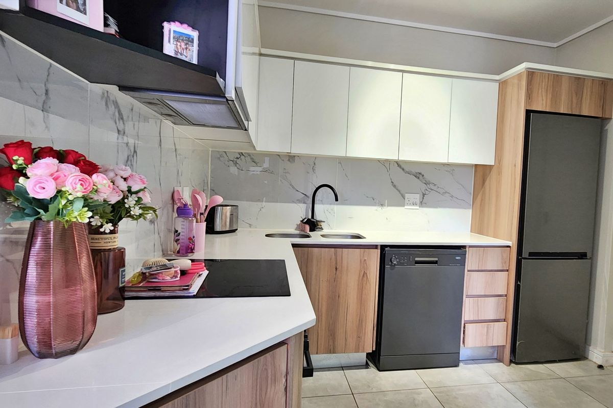 The open-plan kitchen is fully equipped with high-end appliances, including a Defy fridge, dishwasher, and washing machine, as well as loads of cabinetry space and seamlessly blends into the living space. The bright and airy lounge extends onto a small seating balcony through sleek glass sliders, offering a perfect spot to unwind. The unit is DSTV & WiFi ready and is supplied with a backup power supply.