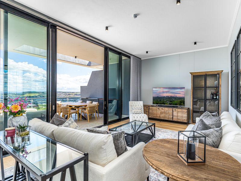 Entertainer's penthouse with panoramic views, rooftop splash pool and built-in braai, steps from Mall of Africa and amenities; marble kitchen with Smeg appliances and two en-suite bedrooms.