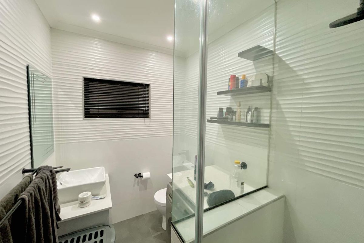 The apartment showcases an open-plan kitchen and living area, creating a seamless and welcoming environment. The modern kitchen is well-equipped with ample cupboard space, elegant granite countertops, a gas hob, and an under-counter oven and space for a dishwasher, making it perfect for both quick meals and culinary adventures. The living area flows effortlessly onto a cozy stoep with a built-in braai, ideal for relaxation and social gatherings.