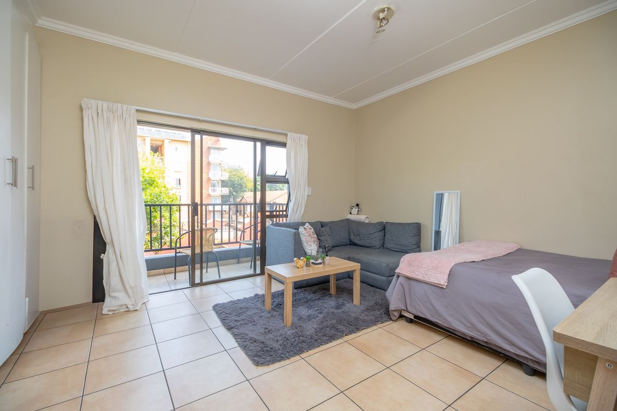 Convenient student living in Hatfield, steps from Gautrain, buses and Menlyn Mall, offering secure lock-up convenience and a communal garden with braai — one-bedroom, one-bath bachelor unit.