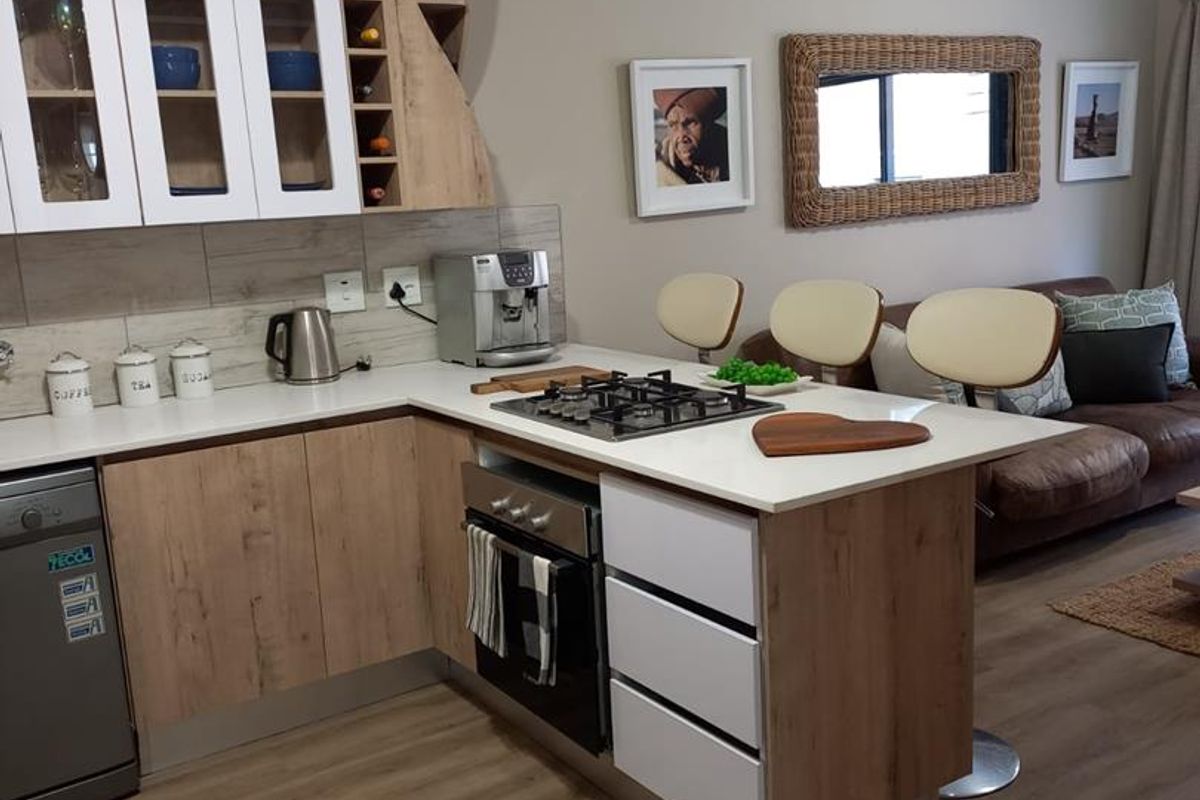 The main bedroom features a private ensuite bathroom, while the open-plan kitchen is fitted with a gas stove, perfect for home chefs, and a gas geyser ensures reliable hot water year-round.
