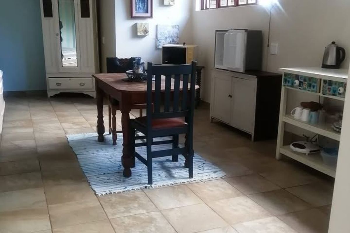 Furnished bachelor apartment to rent for a single person or a couple on a plot just outside Pretoria. Separate shower, toilet, and basin, with a small kitchen setup that includes a microwave and a small fridge. Electricity is prepaid.