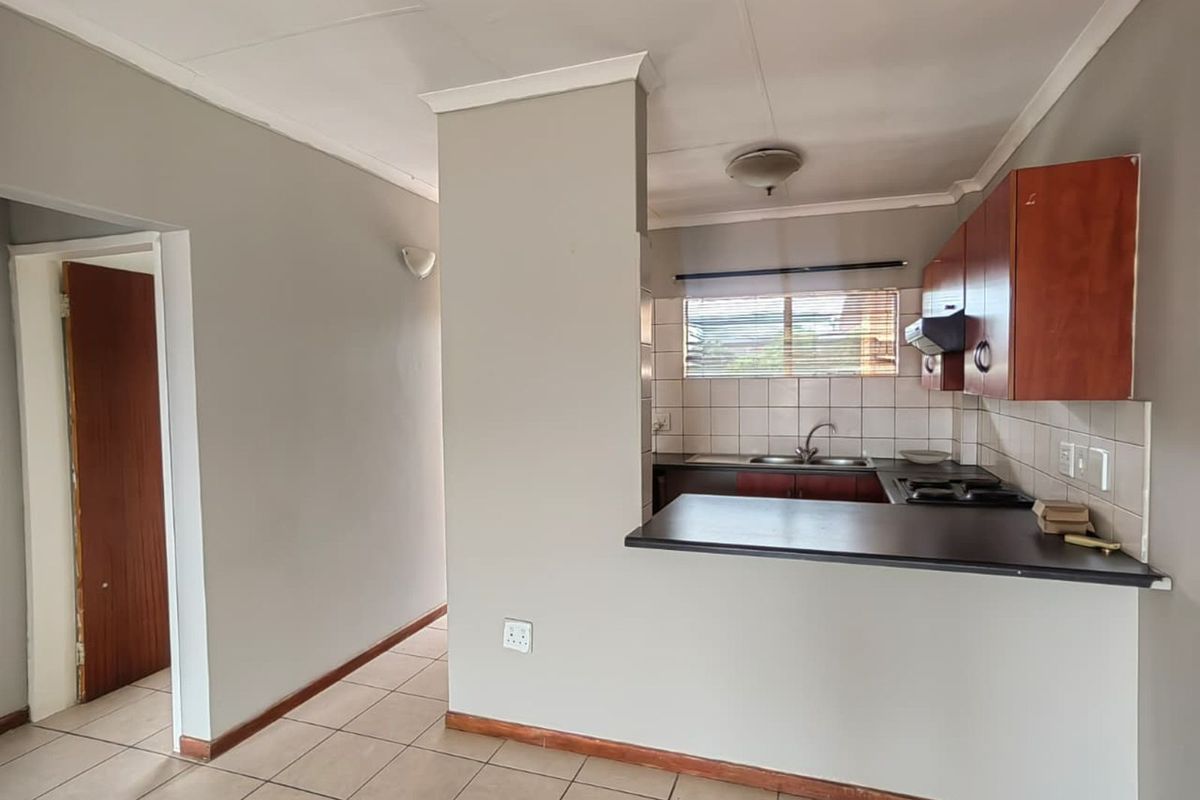 Urban convenience in Pretoria North CBD with an open-concept kitchen flowing into dining and lounge, steps from amenities and transport — two bedrooms, one bathroom, open and covered parking.