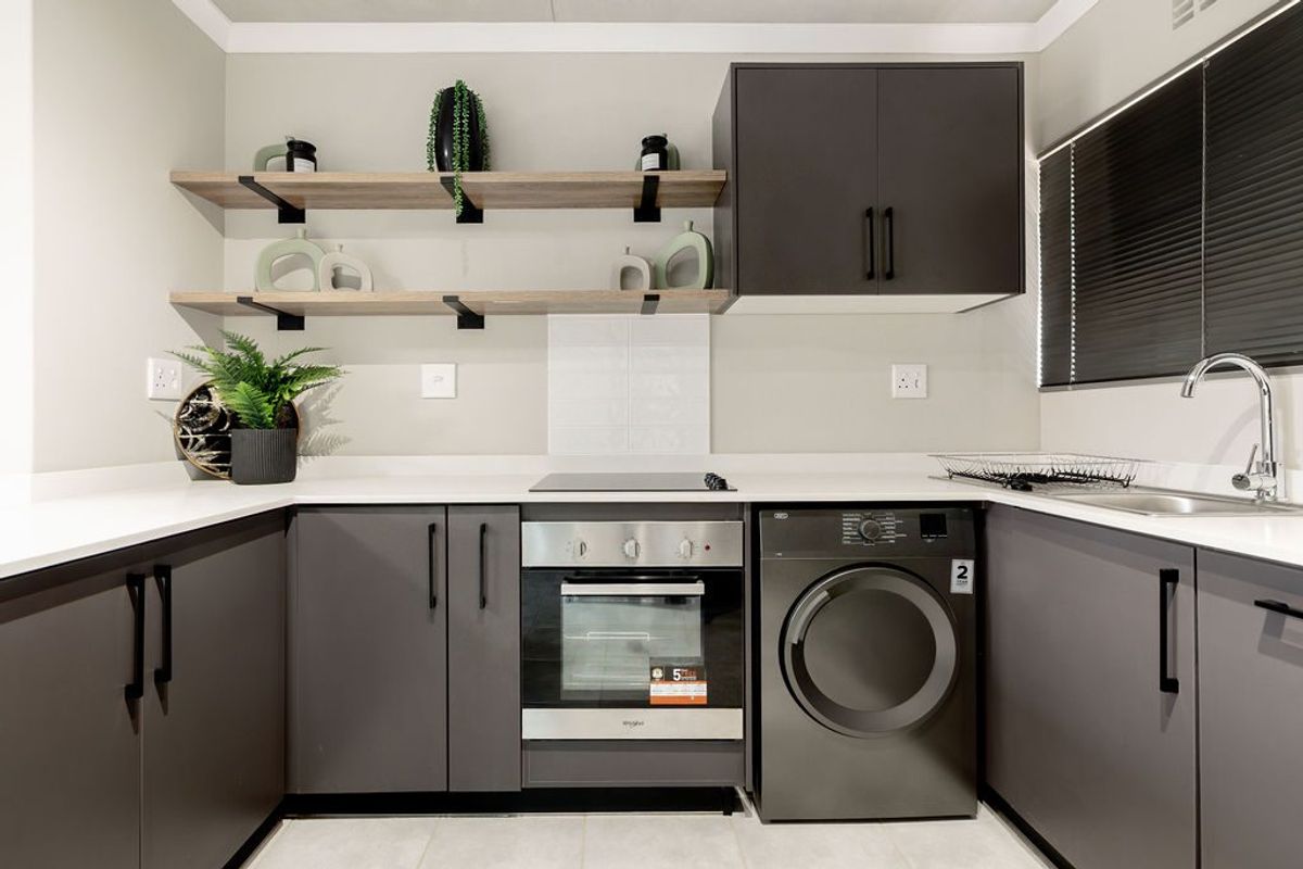 Effortless urban living in Sinoville's iQ Meerendal, steps from shops and transit, featuring sleek modern kitchens — two bedrooms, two bathrooms and two covered carports.