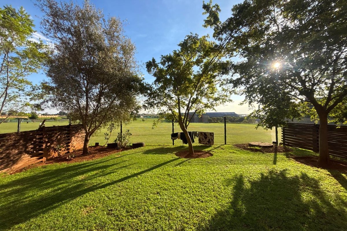 Resort-style living in Hills Game Reserve, Pretoria East — ground-floor apartment with covered patio, built-in braai and generous garden. Three bedrooms, two bathrooms and two covered carports.