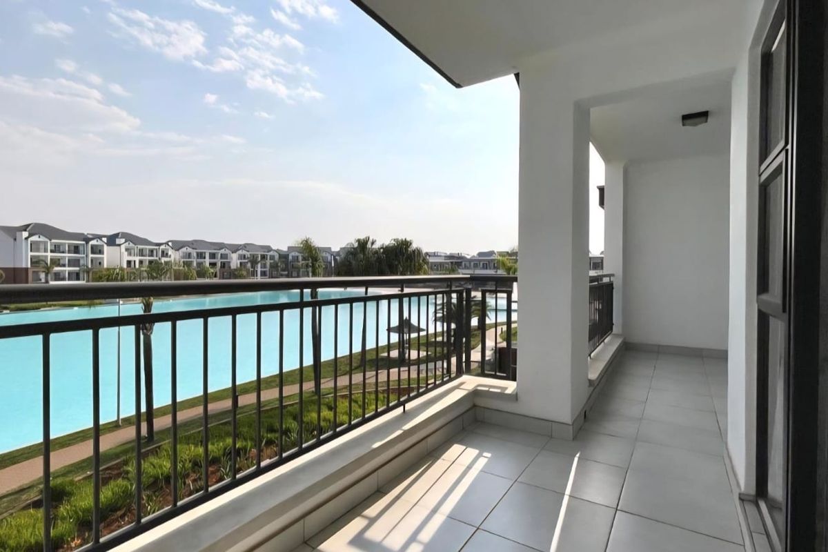 Resort-style living on Pretoria East’s crystal lagoon, with a generous double balcony capturing lagoon views and a fully fitted modern kitchen — one bedroom, one bathroom, covered parking.