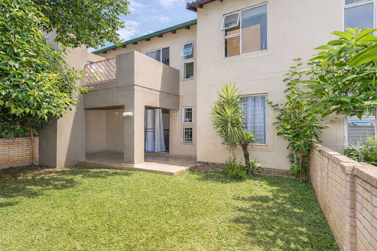 Relaxed ground-floor living in Caymans Complex, Bromhof (Randburg) with park-like communal gardens and pools — private garden and covered patio with built-in braai; two bedrooms, one bath.
