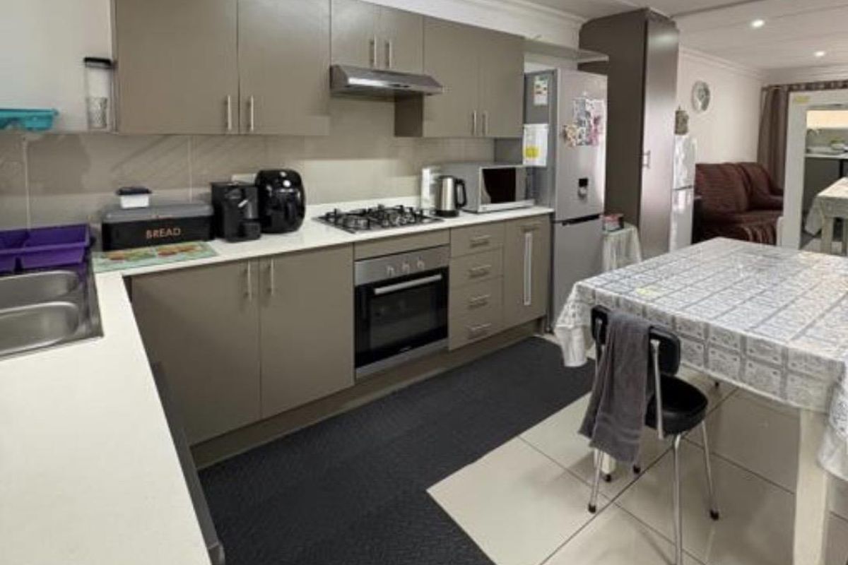 The property features three well-sized bedrooms with built-in cupboards and two bathrooms, including a main en-suite. The open-plan living area flows seamlessly into a modern fitted kitchen, offering ample cupboard space and quality finishes.