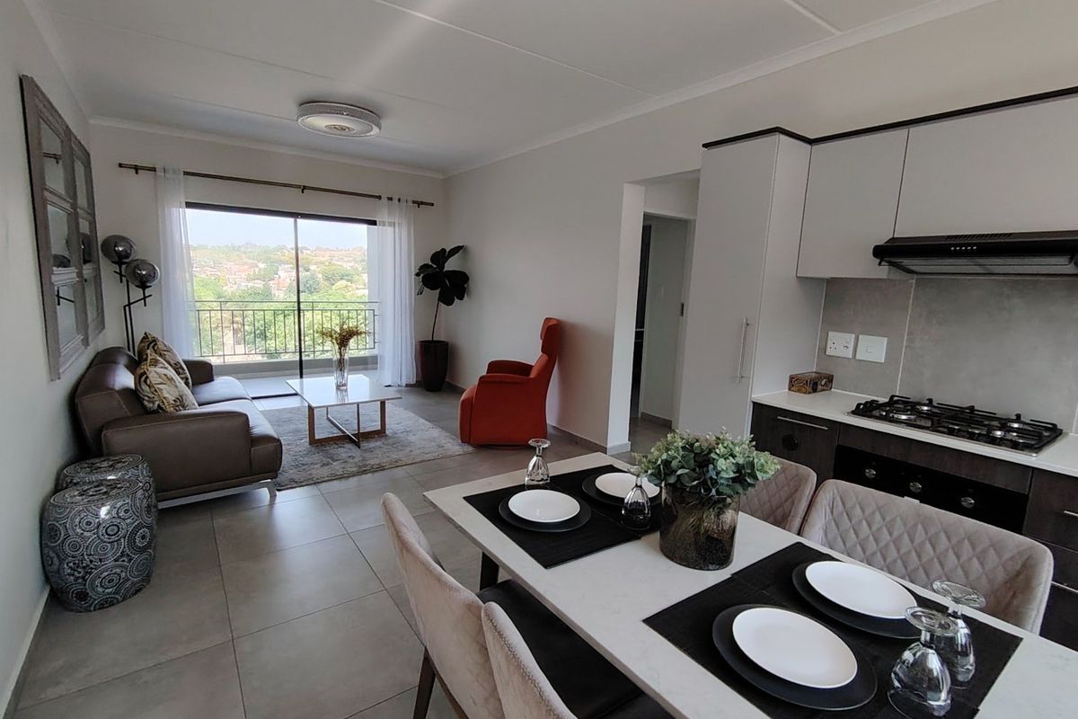Enjoy urban convenience near Fourways Mall and Lanseria in Tamarino Estate, with resort-style pool, modern kitchen with Caesarstone counters, two bedrooms, two bathrooms and two covered carports.