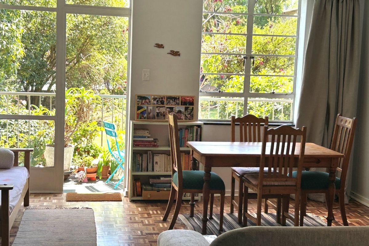 The charm of this apartment extends beyond its interior. A quaint balcony, accessible from both the main bedroom and the lounge, offers serene views of a well-established garden, creating a peaceful and picturesque backdrop.