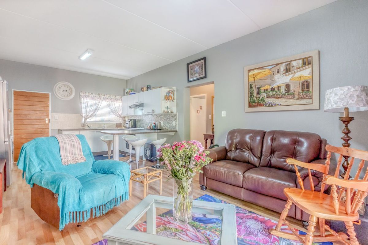 The generous lounge opens seamlessly to a patio where you can enjoy morning coffee or an evening sundowner while overlooking the beautifully maintained communal gardens and listening to the gentle stream nearby – a perfect spot to unwind.