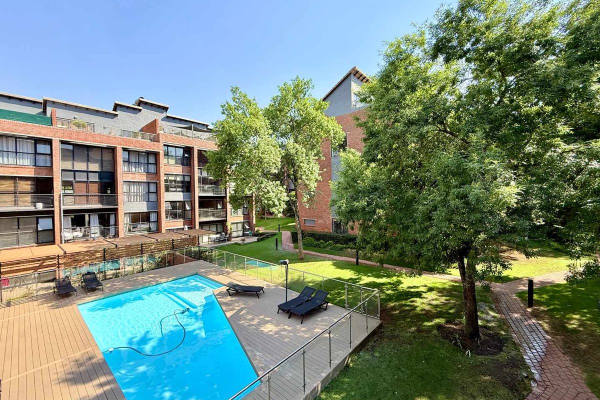 Leafy, relaxed urban living with quick access to Sandton CBD and Gautrain; sunny balcony, granite kitchen and communal pool — two bedrooms, two bathrooms and open parking.