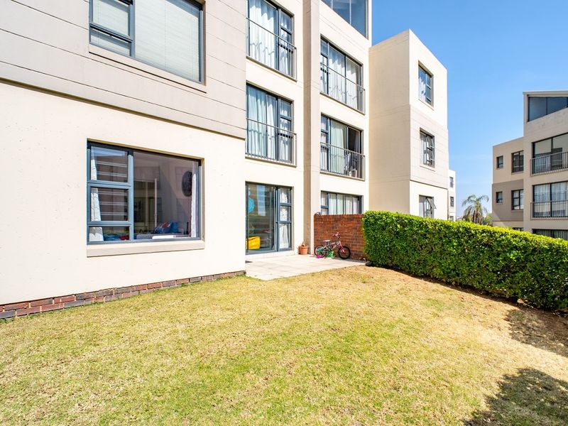 Relaxed urban living with private patio and garden, plus complex pool in sought-after Beverly, Sandton — light-filled ground-floor apartment with office, two bedrooms and two bathrooms.