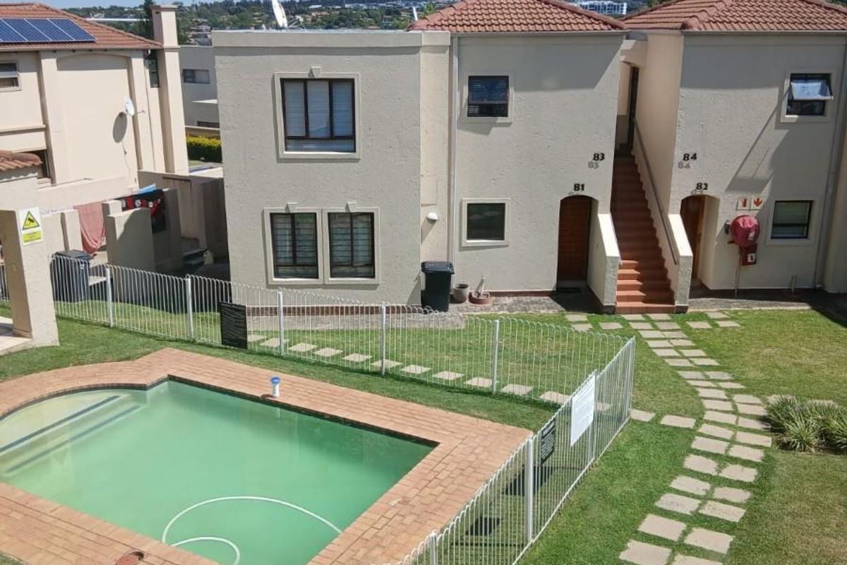 Relaxed, secure estate living near Fourways Mall and Cedar Square, ideal for professionals or investors — first-floor apartment with private covered balcony, modern kitchen, two beds, one bath, covered parking.
