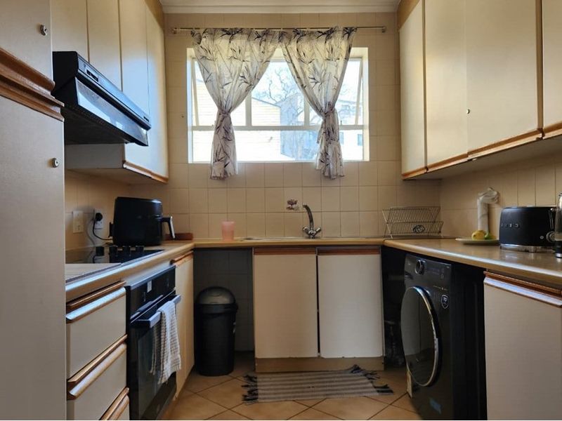 Enjoy secure urban living in Illovo, Sandton—north-facing balcony overlooking Wanderers Oval, modern kitchen with built-in coffee machine, two-bedroom, two-bath apartment with single garage.