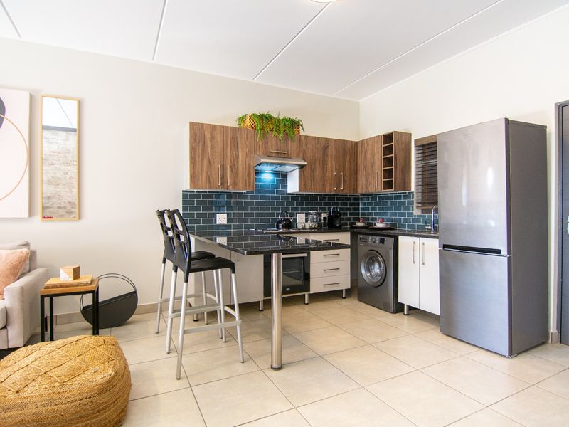 Urban convenience near Sandton and the Gautrain in Linbro Park — modern 1-bedroom loft with fitted kitchen and appliances, plus pool; covered and open parking.