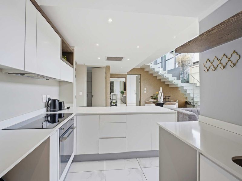 Experience elevated Sandton city living steps from Sandton City and Gautrain, west-facing penthouse with expansive balconies for sunset skyline views, sleek open-plan kitchen; four bedrooms, four bathrooms, two parking.