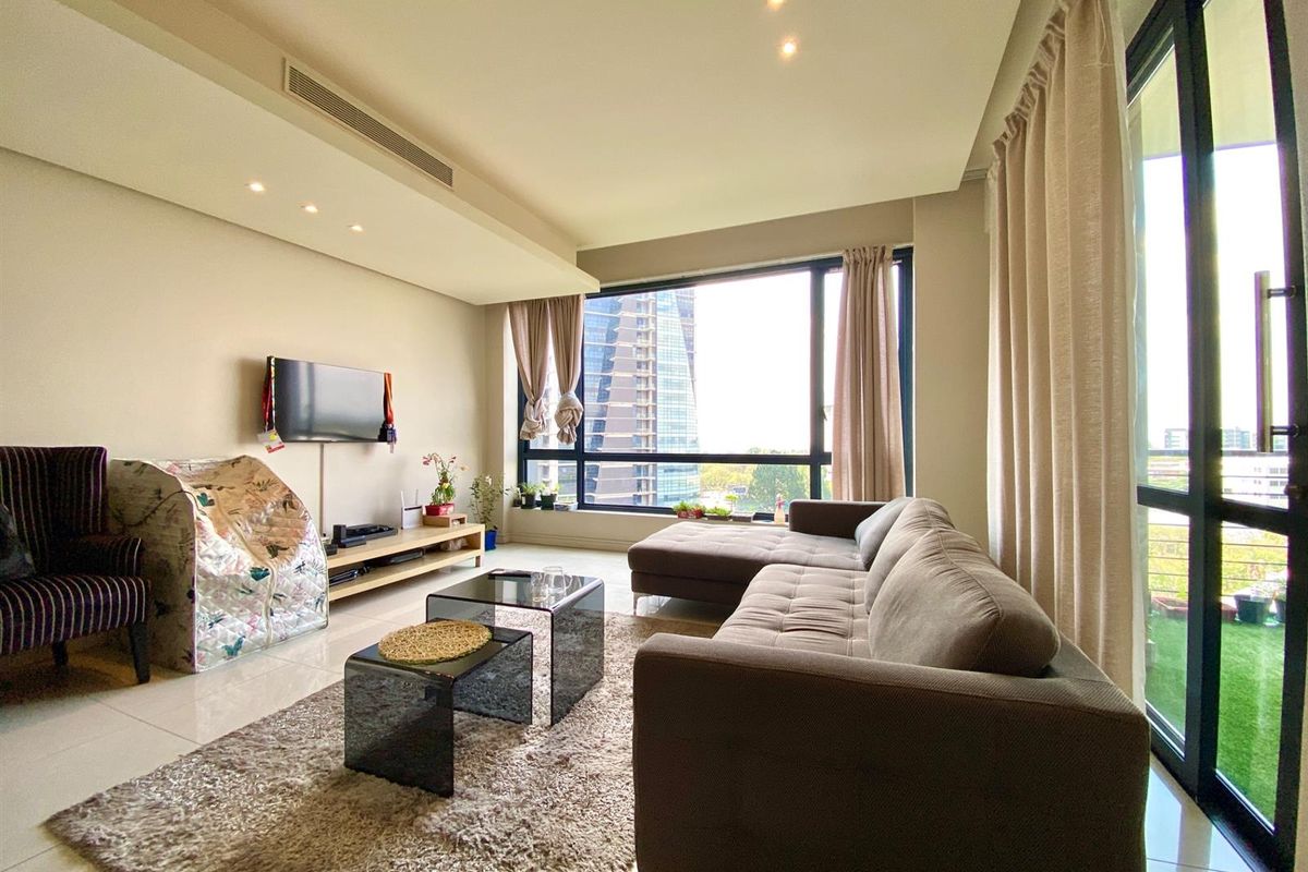 Executive lock-up-and-go living minutes from Sandton CBD and Benmore Centre, near corporate offices and top schools — Miele kitchen, private balcony, biometric lift; two bedrooms, 2.5 baths.