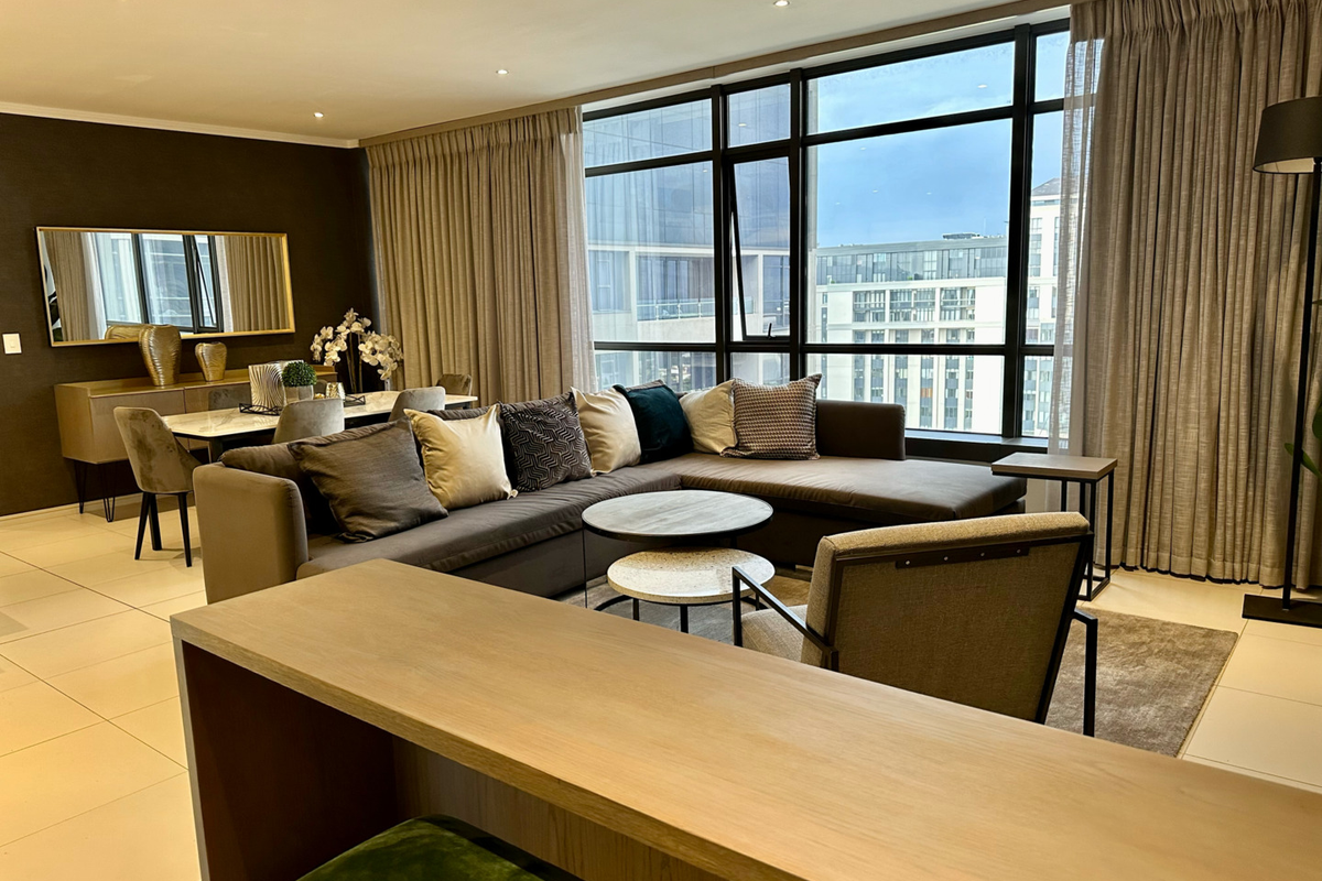 As you step into this luxurious 107-square-meter apartment at Masingita Towers, Morningside, you are greeted by a seamlessly designed living space that exudes both style and comfort. The entire unit has been meticulously furnished to create a sophisticated and inviting atmosphere.