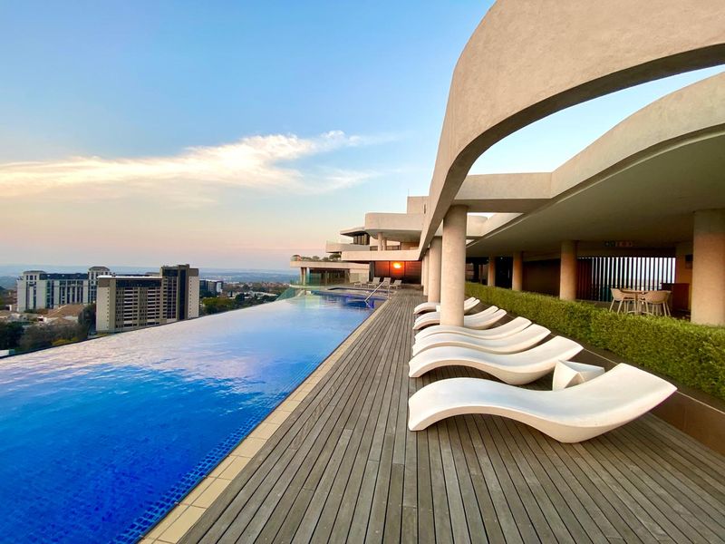 Urban lifestyle in Sandton with panoramic skyline views from a private balcony, open-plan living, fenced pool and clubhouse; fully furnished two-bedroom, two-bath apartment with two basement parking spaces.