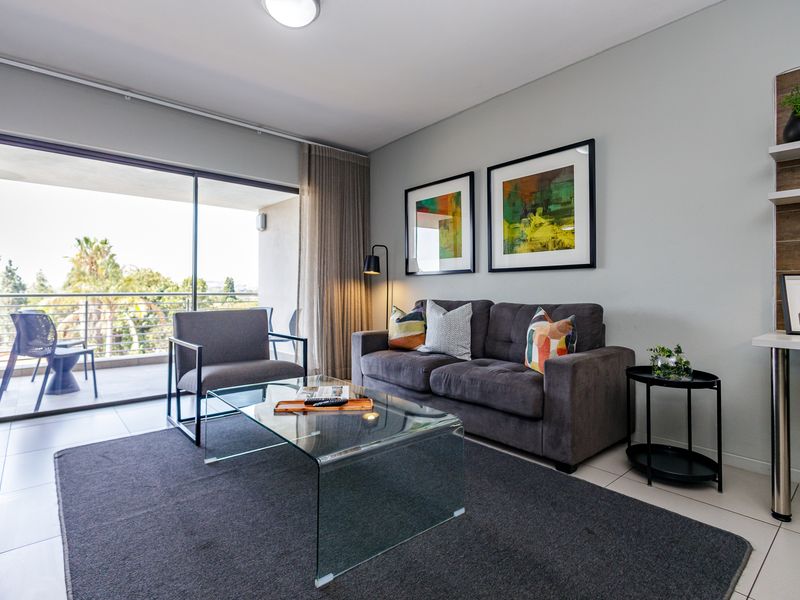 Effortless city living in Morningside, steps from Sandton CBD — light-filled one-bedroom apartment opening onto a tranquil tree-lined communal garden, with pool, clubhouse and covered parking.