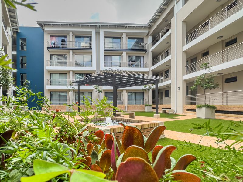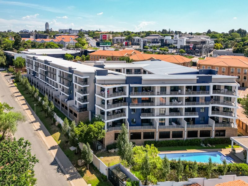 Contemporary apartment offering 'live where you work' convenience just outside Sandton CBD, walking distance to Gautrain bus; clubhouse pool, 24-hour security and backup power. 2-bed, 2-bath, parking.