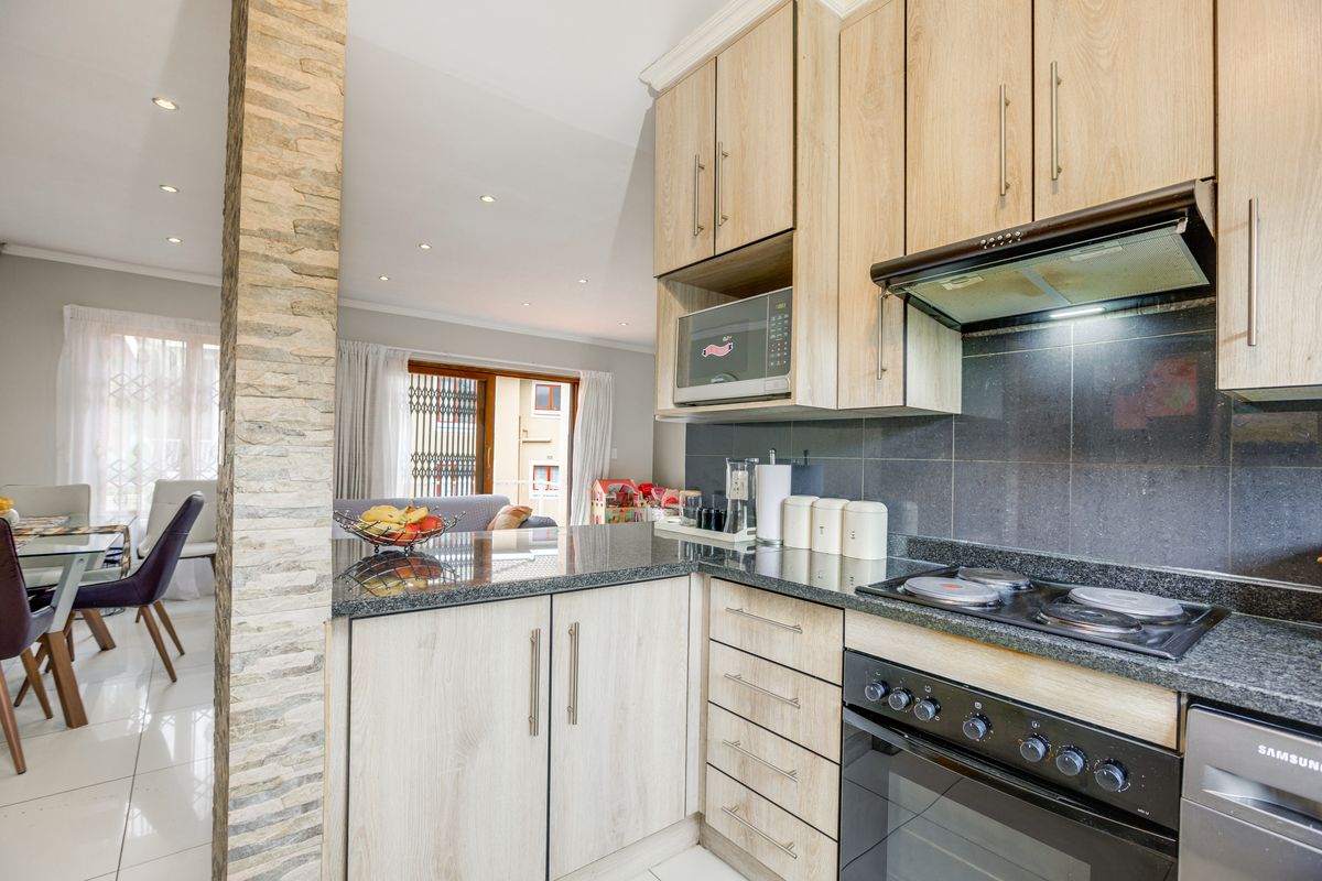 Relaxed Garden Village living in Paulshof near Rietfontein Nature Reserve; bright apartment with modern kitchen and private balcony with built-in braai, pool/clubhouse access, three beds, two baths.