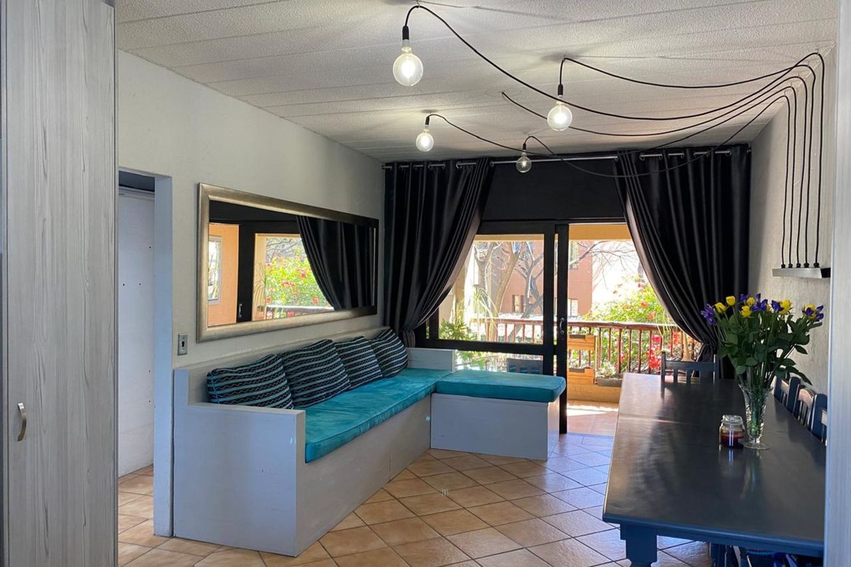 Light-filled urban retreat in Lone Hill, steps from Montecasino and Fourways nightlife, featuring a sleek Smeg-equipped kitchen and covered patio framed by bougainvillea; two bedrooms, secure carport.