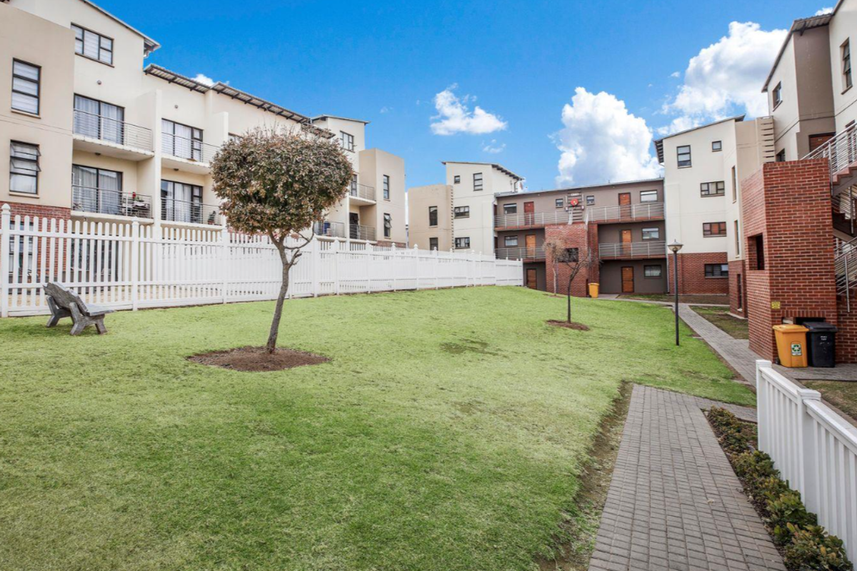 Relaxed estate living with private garden, communal pool and braai in Barbeque Downs near Mall of Africa — modern granite kitchen, two bedrooms, one bathroom and covered parking.