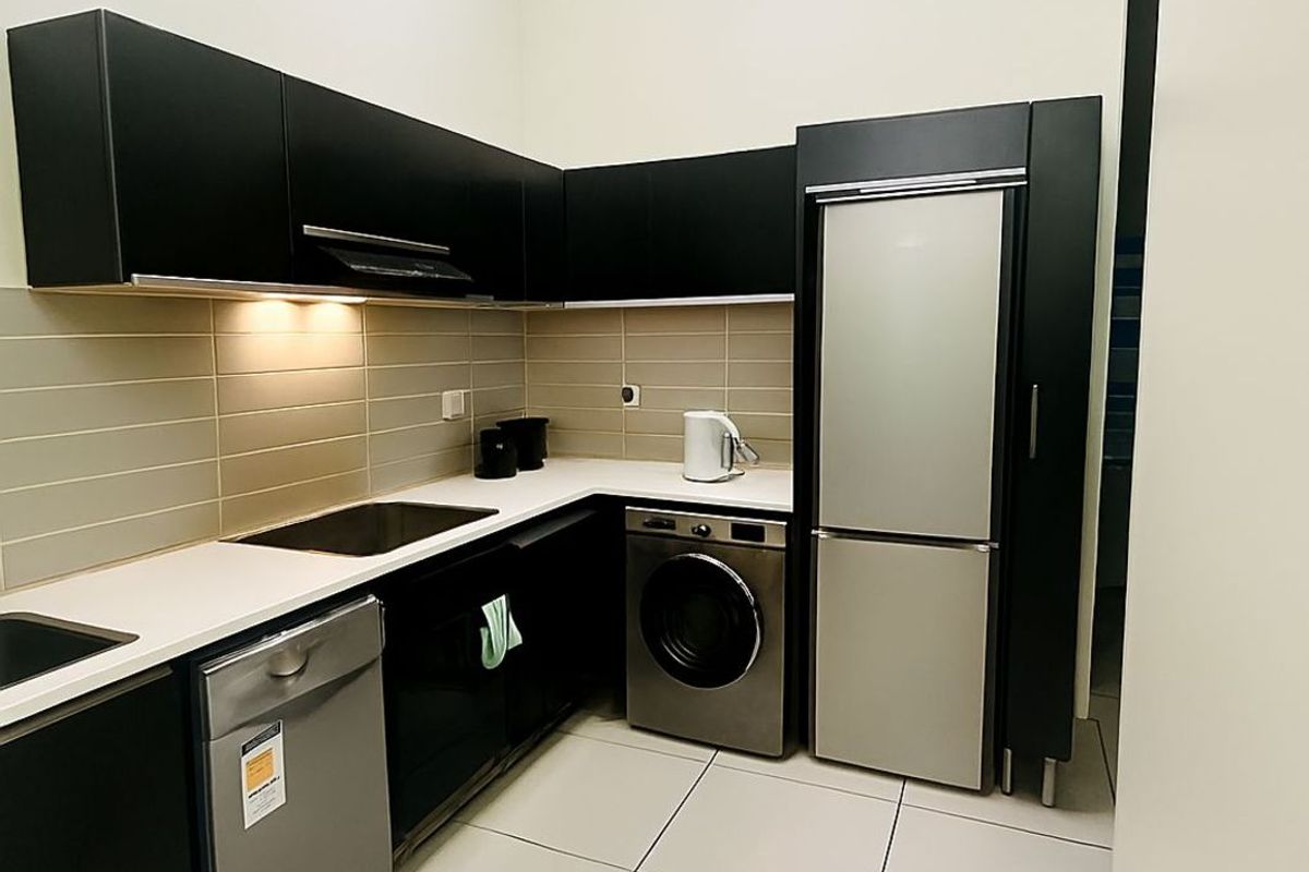 The modern kitchen is fully equipped with a fridge, washing machine, and dishwasher, and seamlessly connects to the open-plan lounge and dining area. A private balcony offers peaceful views, perfect for unwinding at the end of the day. The full bathroom includes both a bathtub and a shower.