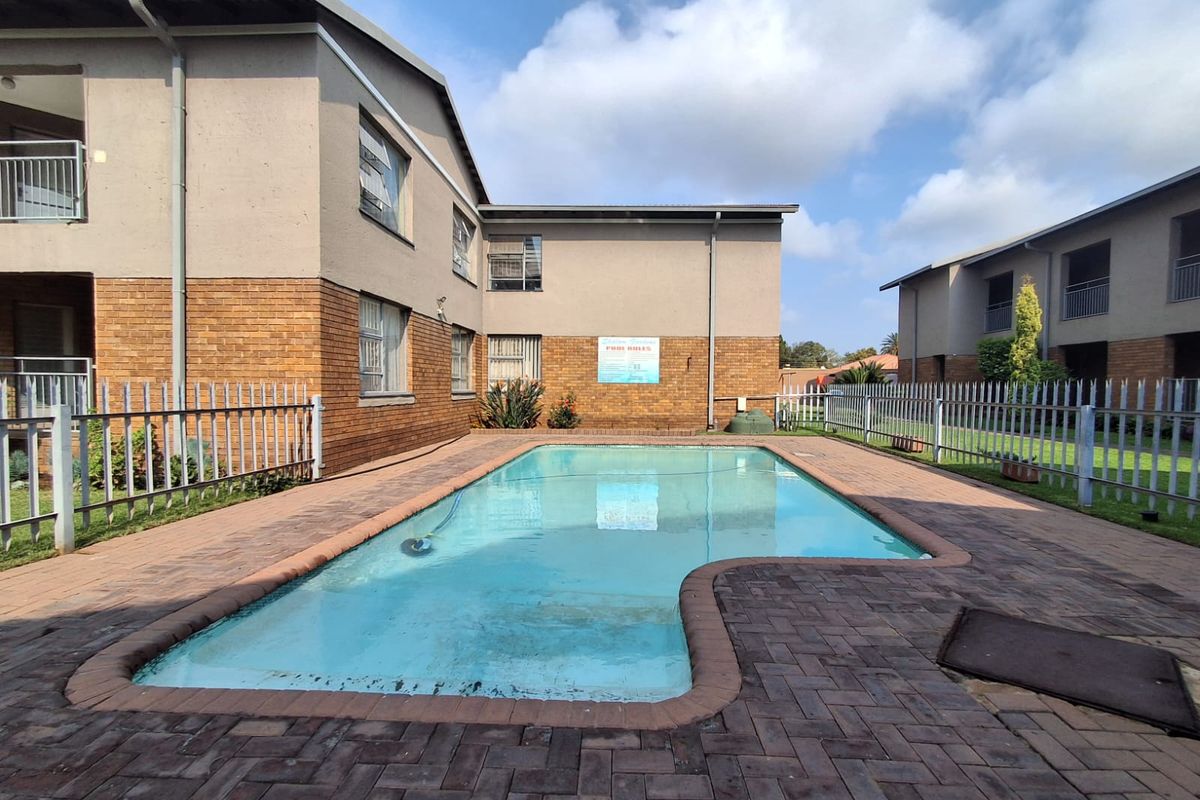 Effortless family living in a peaceful residential enclave with a communal swimming pool for entertaining; spacious 2-bedroom, 1-bath apartment with two garages and ample parking.