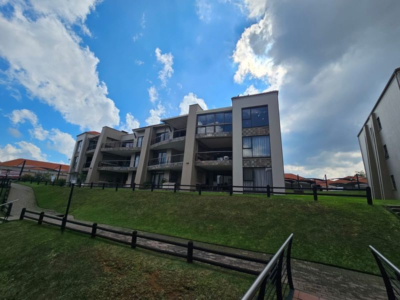 Wake up to panoramic Vaal River and golf-course views in Vanderbijlpark’s estate; open-plan lounge and kitchen, covered patio with built-in braai and river access — 2 bed, 2 bath.