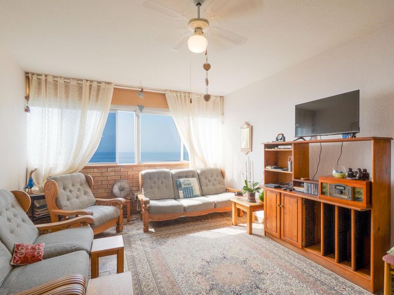 Relaxed coastal lifestyle directly across the beach in Amanzimtoti, with sea views from bedroom and enclosed balcony, open-plan living, Airbnb-friendly and includes two beds, two baths, single garage.