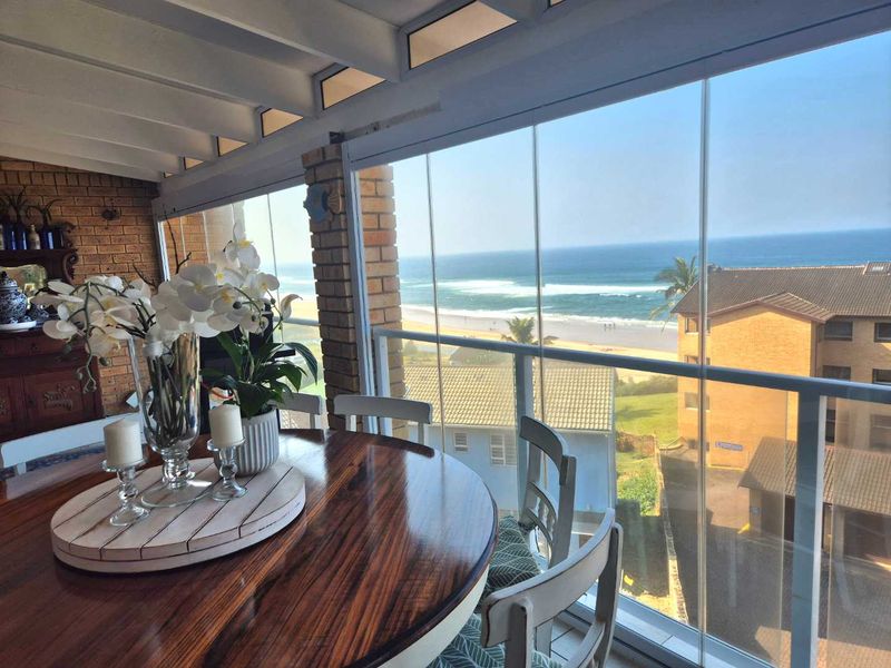 Wake up to uninterrupted 180° Indian Ocean views from this sixth-floor Amanzimtoti beachfront apartment — open-plan living, direct promenade access, communal pool and braai. 2 bed, 2 bath, secure parking.