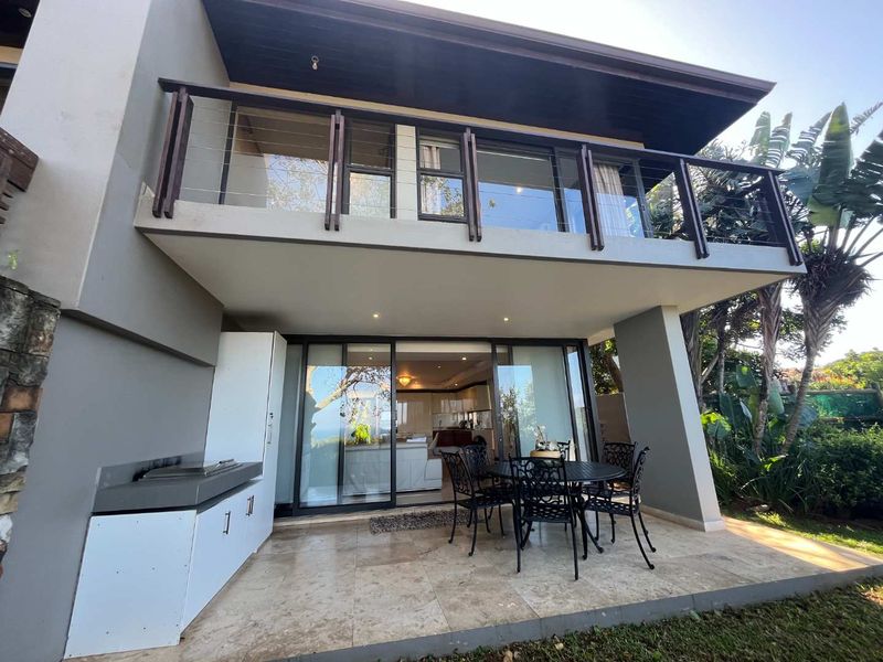 Relaxed coastal estate lifestyle in Sabuti, Simbithi Eco Estate — minutes from Ballito beaches, with a generous covered patio overlooking communal garden and jacuzzi; four bedrooms, three baths.