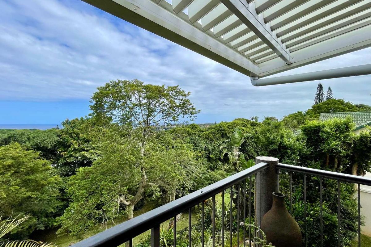 Relaxed coastal estate living in secure Kingston Estate, Ballito Central with distant sea views and birdsong; renovated penthouse featuring a covered patio with adjustable awning for effortless indoor–outdoor entertaining.
