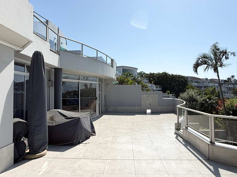 Relaxed coastal estate living in secure Kingston Estate, Ballito Central with distant sea views and birdsong; renovated penthouse featuring a covered patio with adjustable awning for effortless indoor–outdoor entertaining.
