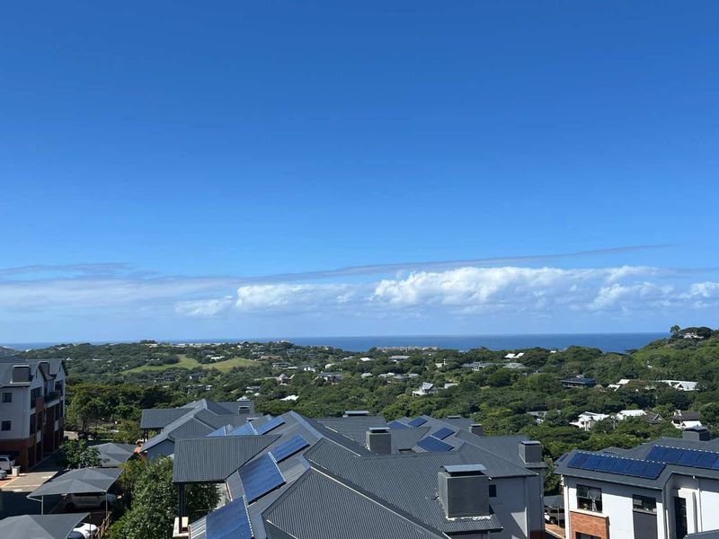 Relax in refined coastal living atop Ballito Hills Estate with panoramic ocean views from a private balcony, custom TV wall, open-plan kitchen/lounge — two beds, two baths, two covered parking.