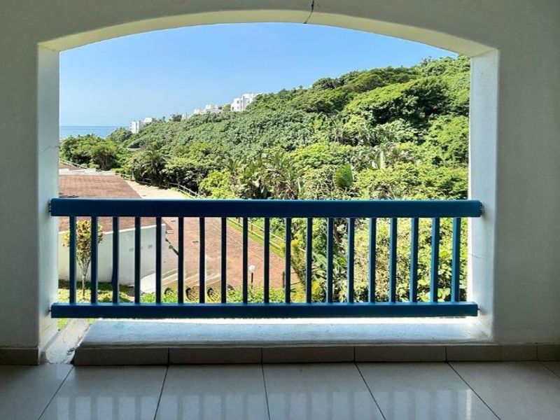 Sunrise sea breezes and coastal access in Imbali Ridge, between Seaward and Zimbali — open-plan living with modern kitchen and spacious patio overlooking greenbelt and distant sea; two en-suite bedrooms.