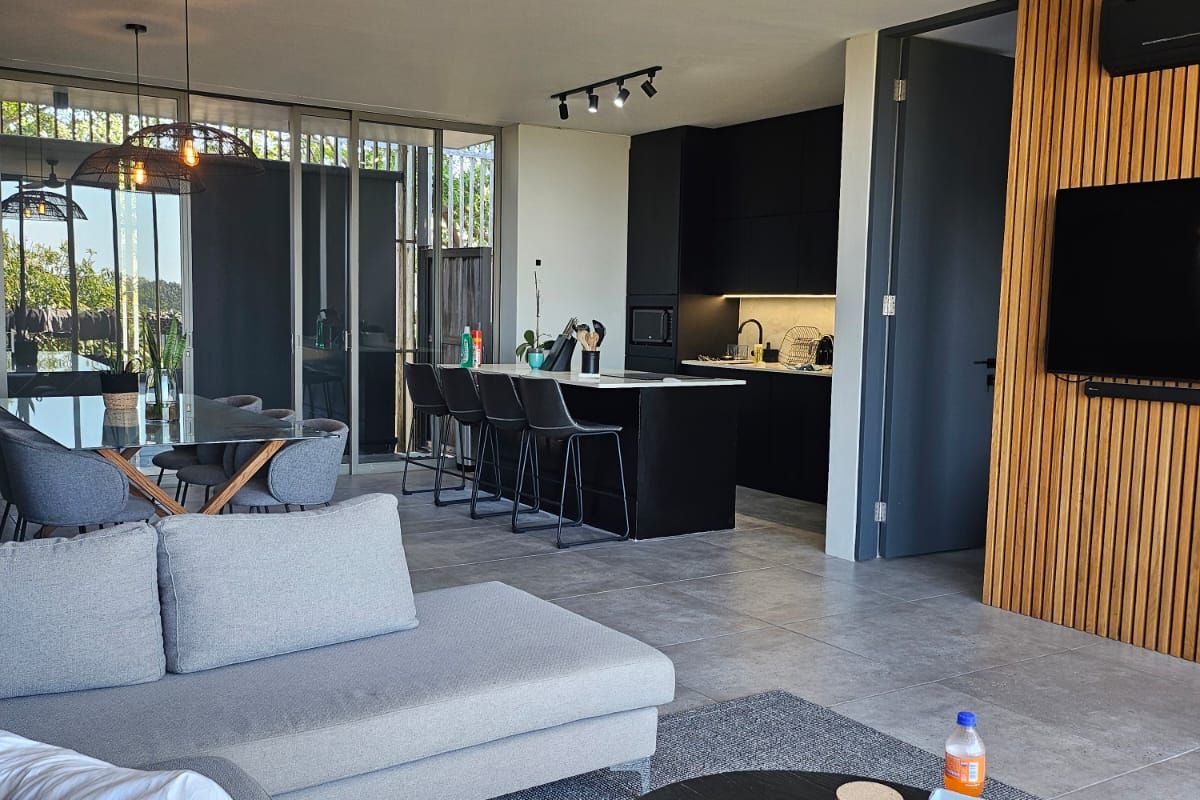 Serene forest-view apartment in leafy Dunkirk Estate, minutes from Salt Rock beach; open-plan living with stack-back doors and private covered patio overlooking the greenbelt. Two beds, two baths, covered parking.