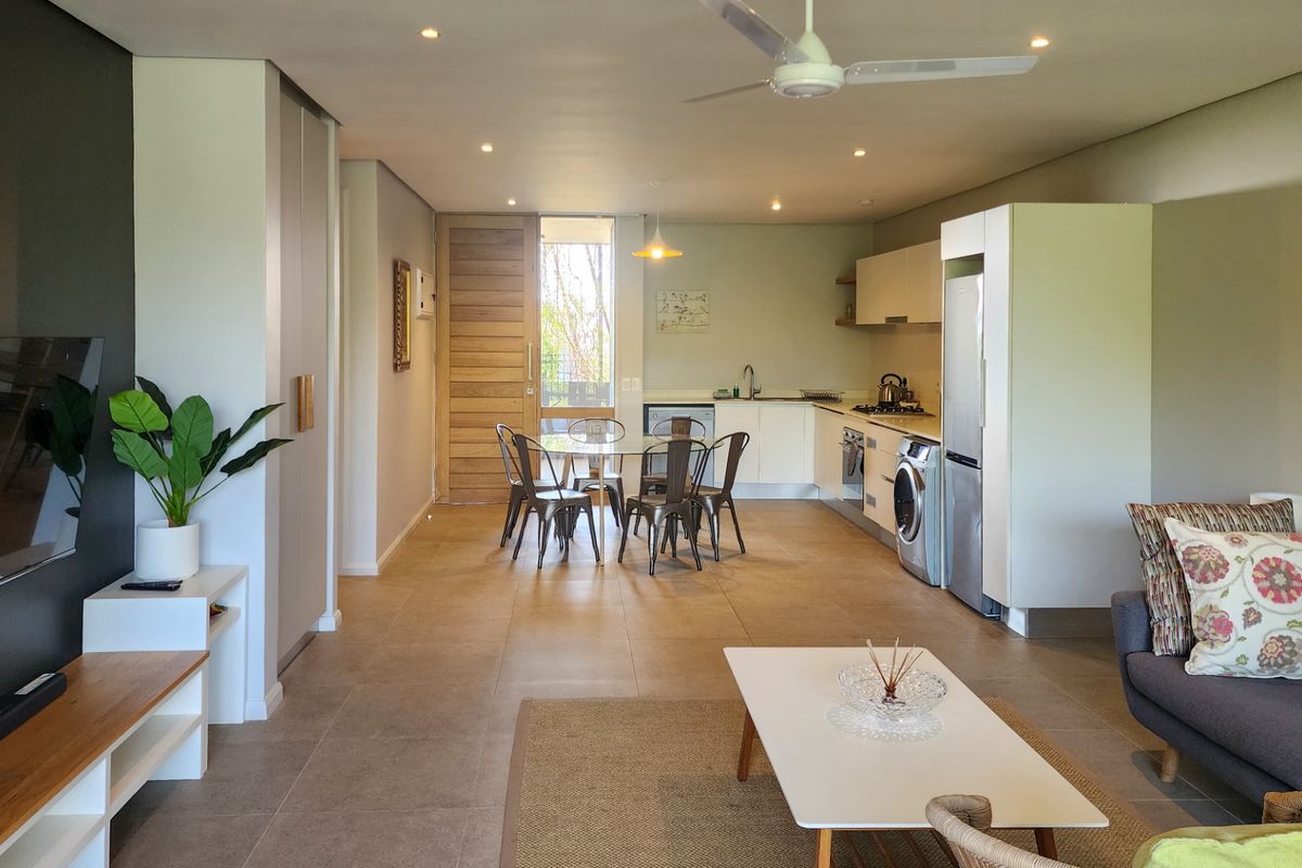This modern two-bedroom apartment in Elaleni Coastal Forest Estate is a single-level unit with high-end finishes throughout. It includes an open-plan living and entertainment area at the entrance that leads out onto a private balcony. The main bedroom has balcony access and an en-suite bathroom.