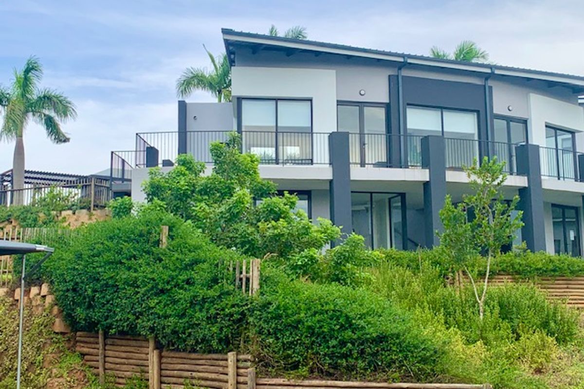 Coastal family living in a secure estate with 24-hour access, elevated balcony views and communal pool — two-bedroom, two-bath apartment with two undercover parking, minutes to Umhlali Primary.