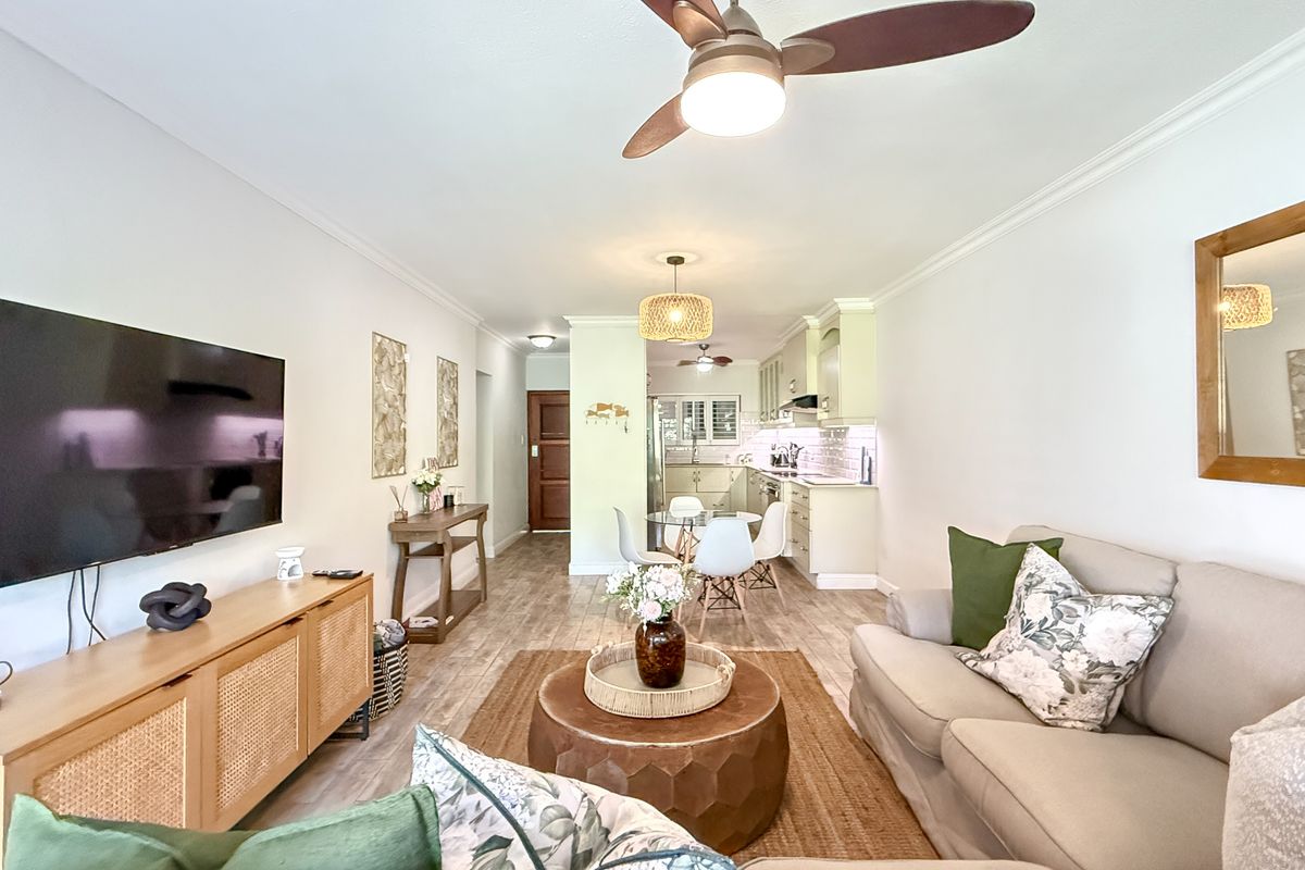 Coastal escape across from Willard's Beach, minutes from shops and restaurants, in a tropical, secure complex. Two bedrooms open onto a private balcony; three beds, two baths, covered parking.